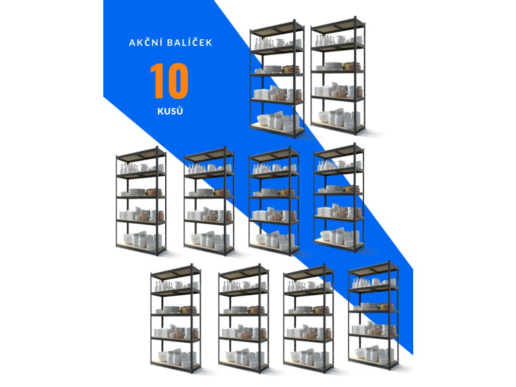 Akční balíček - 10x Kovový regál 180x70x30cm, lakovaný - černý, 5-policový, nosnost 875kg