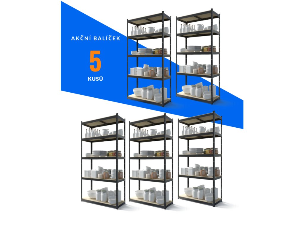 Akční balíček - 5x Kovový regál 180x70x30cm, lakovaný - černý, 5-policový, nosnost 875kg