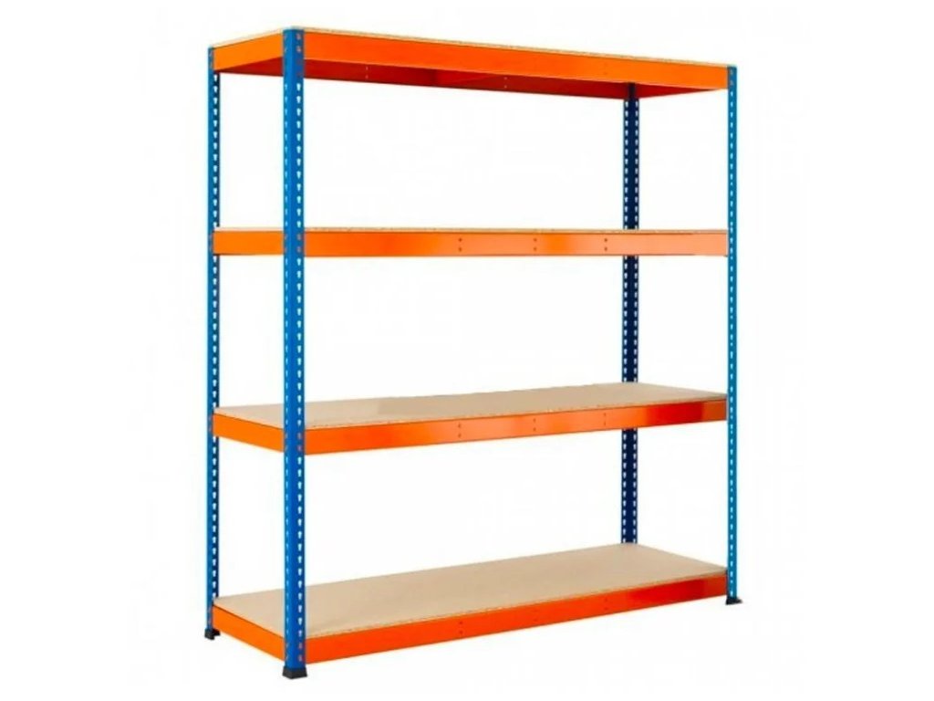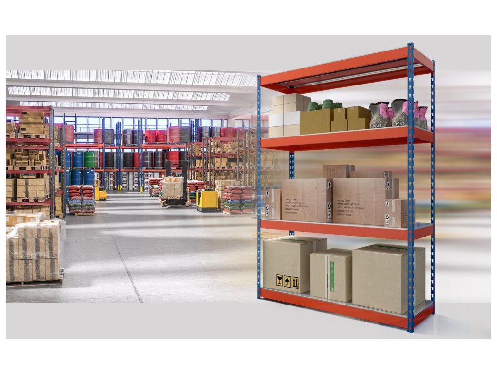 Kovový průmyslový regál 180x160x60cm, lakovaný - modro/oranžový, 4-policový, nosnost 1200kg